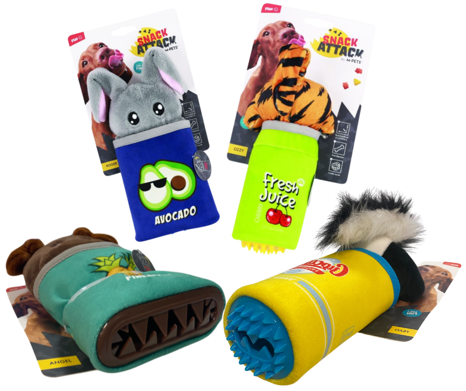 Podium naszego zestawienia najlepszych zabawek dla psów otwierają Pluszowe dyspensery przysmaków dla psa - Snack Attack od marki M-PETS. Składają się one z dwóch części: pluszowej góry z ukrytą wewnątrz poduszką powietrzną, po naciśnięciu której pluszak unosi uszy lub ogon, tym samym jeszcze bardziej zwracając uwagę psa, oraz gumowego dołu idealnego do ukrycia smakołyków. Występują w wielu różnych kształtach, które przypadną do gustu wielu czworonogom.