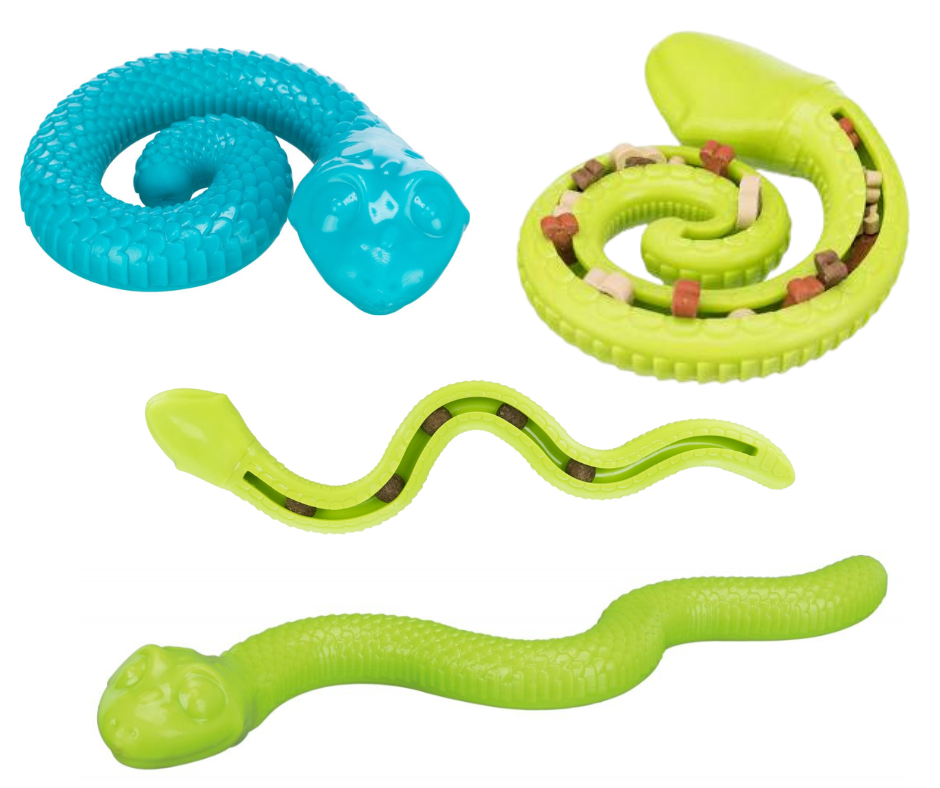 Kolejna zabawka w top 10 zabawek dla psa- Węże na przysmaki TRIXIE Snack-Snake to zabawka, która zajmie psa na dłużej i zaspokoi jego naturalną potrzebę lizania. Lizanie jest dla psów niezwykle ważne- pomaga się uspokoić, wyciszyć i skoncentrować. Podczas lizania w psim mózgu uwalniają się endorfiny, które redukują stres, a sama czynność angażuje psa mentalnie, co rozwija jego umiejętność koncentracji i pozwala lepiej radzić sobie z emocjami. Jak wykorzystać węża na przysmaki TRIXIE Snack-Snake? wystarczy, że napełnisz węża ulubioną karmą, musem, masłem orzechowym lub przysmakami i podasz swojemu pupilowi (w cieplejszych miesiącach możesz również zamrozić węża z przekąskami i wykorzystać go jako zabawkę chłodzącą).