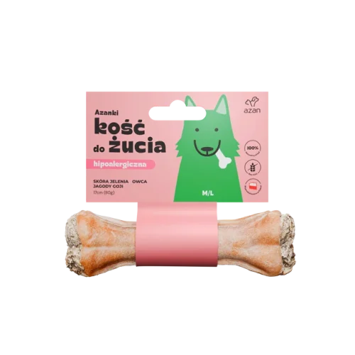 Azanki Kość do żucia M/L ze skóry jelenia z owcą i jagodami goji to wyśmienity przysmak dla dorosłych psów średnich i dużych ras, zaspokajający ich naturalną potrzebę gryzienia i żucia. Kości nie zawierają ostrych i kruchych elementów, stanowiąc bezpieczniejszą alternatywę dla rozmaitych gryzaków.
