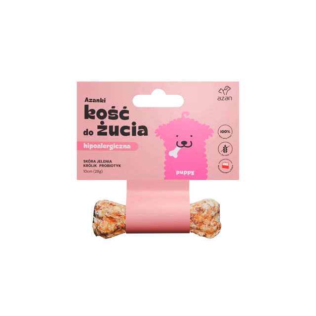 Azanki Kość do żucia Puppy ze skóry jelenia z królikiem i probiotykiem to wyśmienity przysmak dla szczeniąt, zaspokajający ich naturalną potrzebę gryzienia i żucia, która jest szczególnie nasilona w okresie wymiany zębów. Kości nie zawierają ostrych i kruchych elementów, stanowiąc bezpieczniejszą alternatywę dla rozmaitych gryzaków.