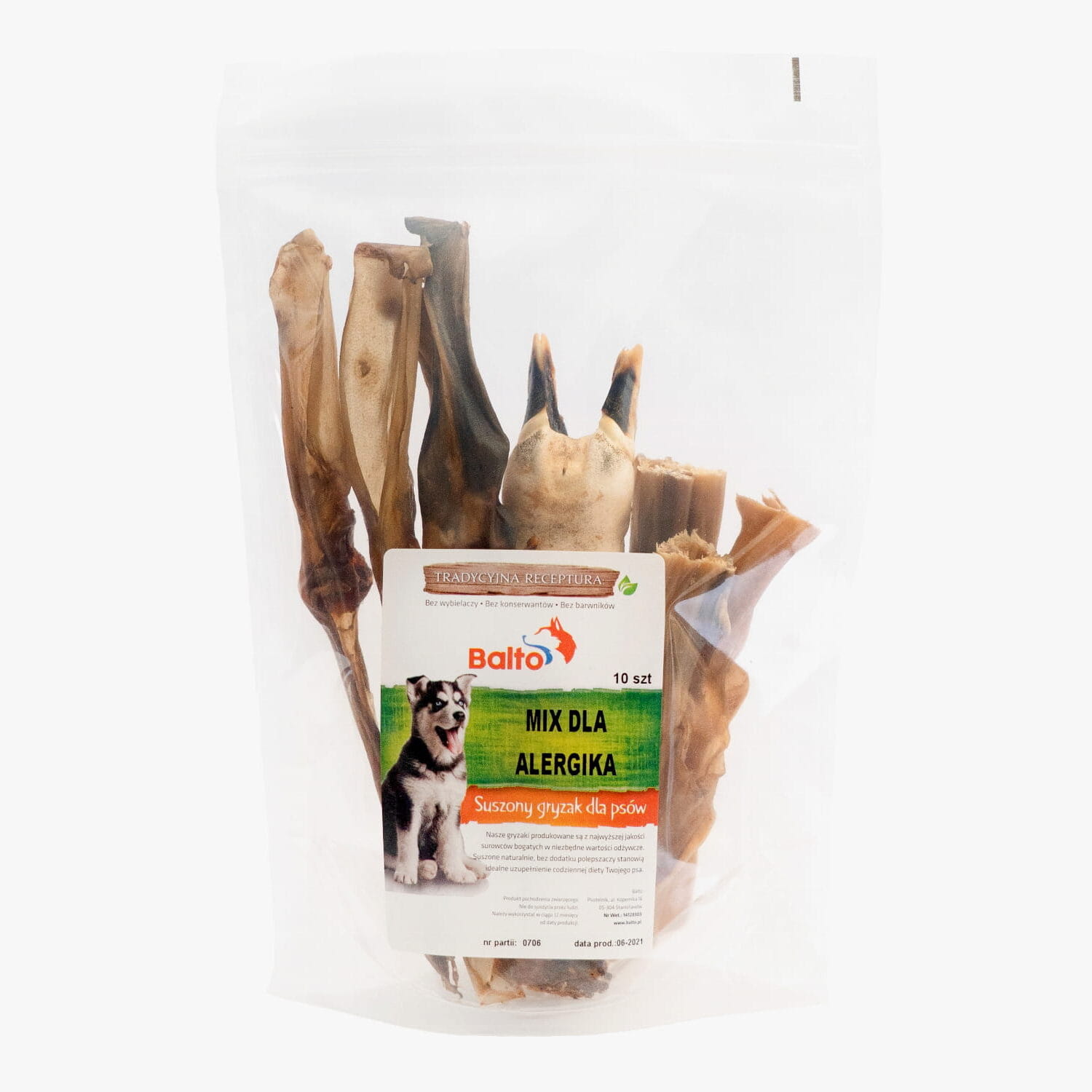 Zestaw hipoalergicznych gryzaków odpowiednich dla psów ze skłonnościami do alergii, nietolerancji pokarmowych oraz problemów trawiennych. Zestaw zapakowany w wygodny, przezroczysty worek typu doypack ze struną, który można szczelnie zamknąć, niwelując nieprzyjemny zapach oraz bezpiecznie przewozić w czasie wycieczek, czy wakacyjnych wyjazdów. W tym zestawie Twój pies może znaleźć: – szyjki kurze – racica barania lub sarny – skóra barania lub królicza – ucho królicze lub baranie * Podane zawartości mogą różnić się nieznacznie w gotowym zestawie i są uzależnione od poszczególnych wag składowych. dokładne opisy każdego składnika w opisach poszczególnych produktów. Każdy produkt z zestawu może uczulić psa, ponieważ alergie są osobniczo zmienne – u psów z alergiami podawać po konsultacji z lekarzem weterynarii GRYZAKI BALTO
