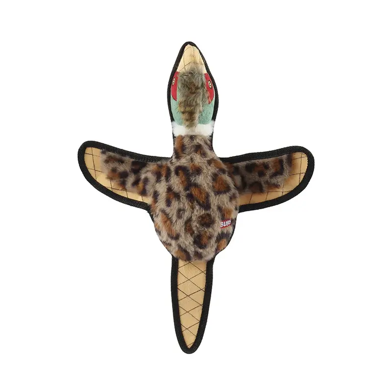 Pluszowy bażant dla psów ras średnich i dużych. Zabawka pikowana, wykonana z mocnego materiału z dodatkowymi obszyciami, by zabawa trwała w najlepsze przez długie godziny! Wierzch zabawki pokryty jest miłym, włochatym materiałem imitującym upierzenie. Posiada dużą piszczałkę, która chrumka!