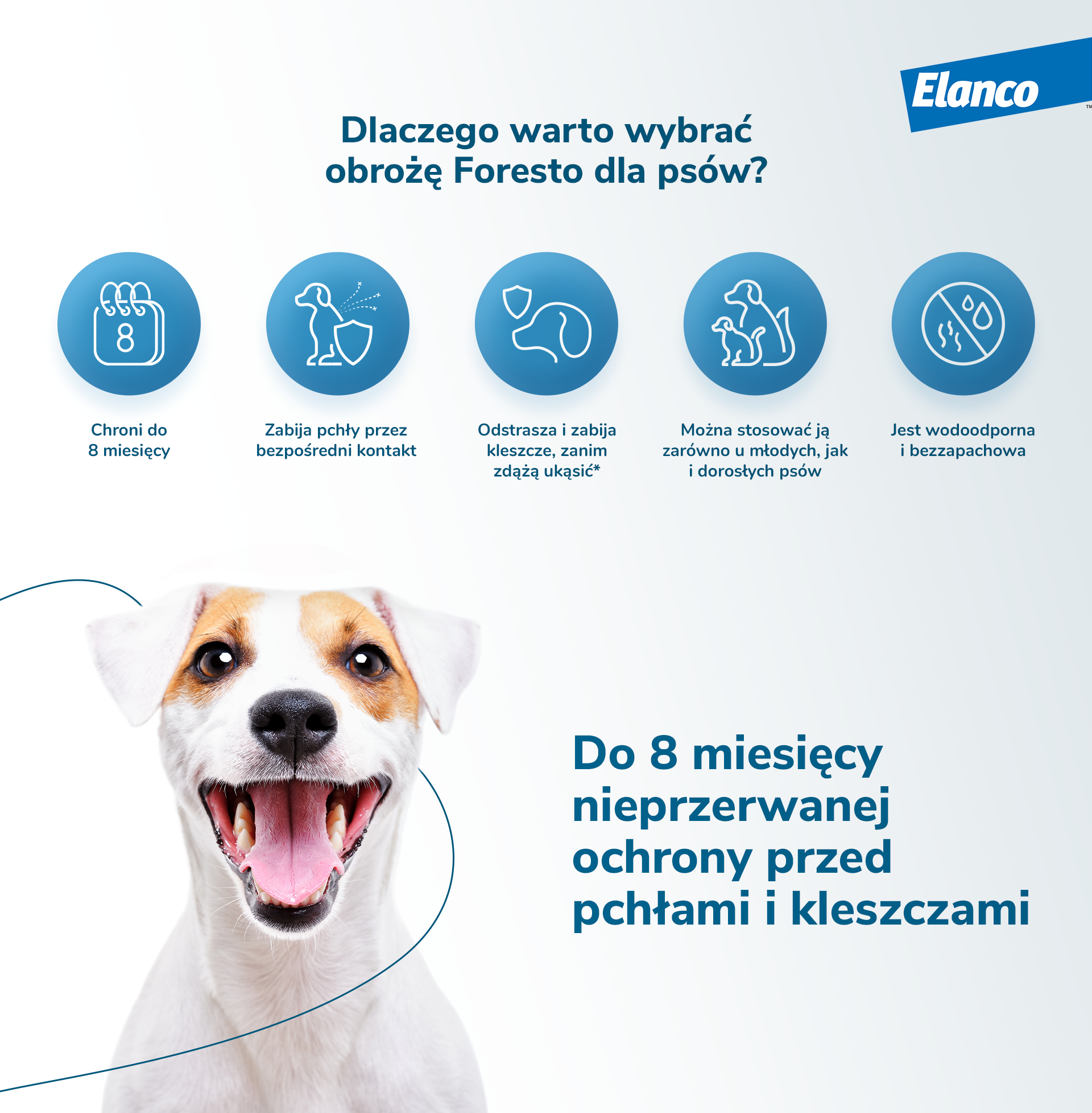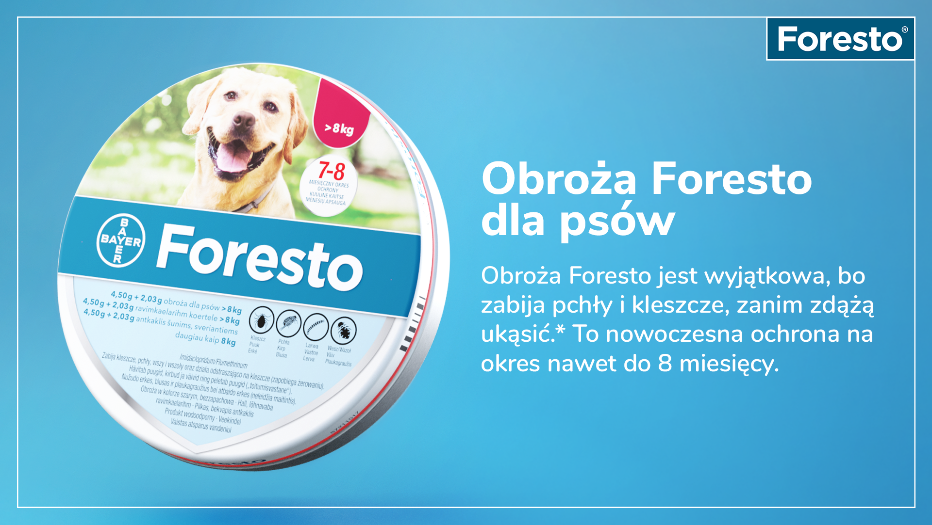 Działanie: Jedna obroża o długości 70 cm (45 g) zawiera imidaklopryd w dawce 4,5 g oraz flumetrynę w dawce 2,03 g jako substancje czynne. W celu leczenia i zapobiegania infestacji pcheł (Ctenocephalides felis) przez okres 7 do 8 miesięcy. Skuteczność przeciwpchelna zostaje osiągnięta natychmiast po założeniu obroży. W celu ochrony bezpośredniego otoczenia zwierzęcia przed rozwojem larw pcheł przez 8 miesięcy. Foresto może być stosowane jako element strategii zwalczania alergicznego pchlego zapalenia skóry (APZS). Produkt wykazuje długotrwałą skuteczność roztoczobójczą (zabija kleszcze) w przypadku infestacji kleszczy (Ixodes ricinus, Rhipicephalus sanguineus, Dermacentor reticulatus) oraz odstraszającą (zapobiega żerowaniu) przy infestacji kleszczy (Ixodes ricinus, Rhipicephalus sanguineus) przez okres 8 miesięcy. Produkt wykazuje skuteczne działanie przeciwko larwom, nimfom i dorosłym osobnikom kleszczy. W przypadku uprzedniego występowania kleszczy u psa przed rozpoczęciem leczenia, założenie obroży może w ciągu 48 godzin nie spowodować śmierci pajęczaków; kleszcze mogą pozostać wczepione i widoczne. Dlatego też, zaleca się usunięcie kleszczy występujących już na zwierzęciu w momencie zakładania obroży. Działanie zapobiegające infestacji nowych kleszczy rozpoczyna się w ciągu 2 dni po założeniu obroży. W celu leczenia infestacji wszołów (Trichodectes canis). Najlepiej gdy obroża jest zakładana przed początkiem sezonu występowania pcheł lub kleszczy.