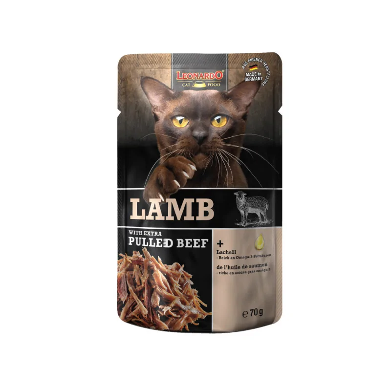 Dzięki naszej gamie produktów Leonardo Pulled Beef możesz teraz podzielić się tym wyjątkowym smakiem również z Twoim kotem. Każdy przepis jest starannie przygotowywany, a delikatnie smażone mięso jagnięce w połączeniu z aromatyczną szarpaną wołowiną tworzą wyjątkowe danie, które zachwyci podniebienie Twojego kota.