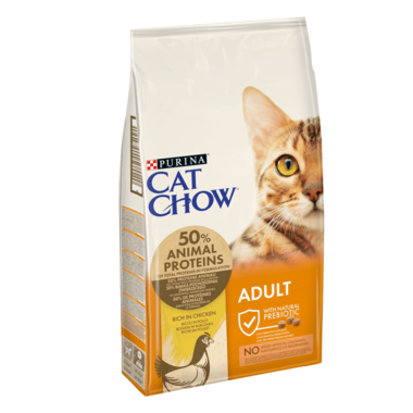 Cat Chow Adult to sucha karma dla kotów, która zawiera wszystkieskładniki odżywcze niezbędne do tego, by Twój kot mógł prowadzić aktywne dorosłe życie. Pokarm zawiera witaminę E, aby wspomagać naturalnąodporność kota oraz witaminy z grupy B, aby pomóc mu efektywnie wykorzystywać energię. Dzięki wyselekcjonowanym źródłom białka karma Cat Chow Adult dodatkowo pomaga budować sline mięśnie kotów.