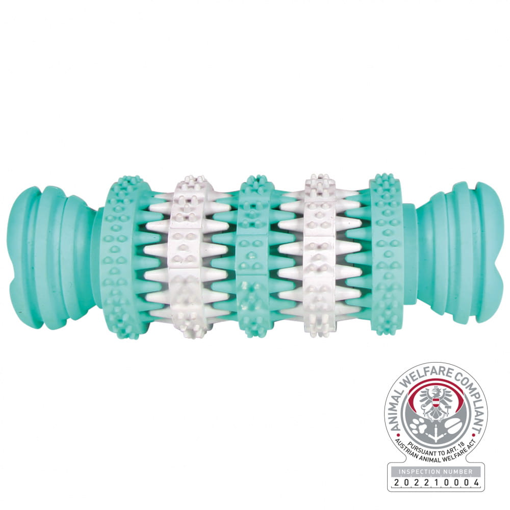 Kauczukowa kość Denta Fun to doskonała zabawka dla psa, która nie tylko zapewnia długotrwałą rozrywkę, ale także dba o higienę jamy ustnej. Wykonana z wytrzymałego kauczuku, ma miętowy smak, co sprawia, że pies będzie chętnie się nią bawił. Dodatkowo, dzięki specjalnemu kształtowi, kość masuje dziąsła, co przyczynia się do zdrowia zębów i dziąseł. Produkt jest zgodny z ustawą o ochronie zwierząt - §18 (AT).